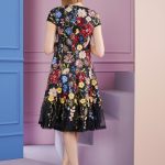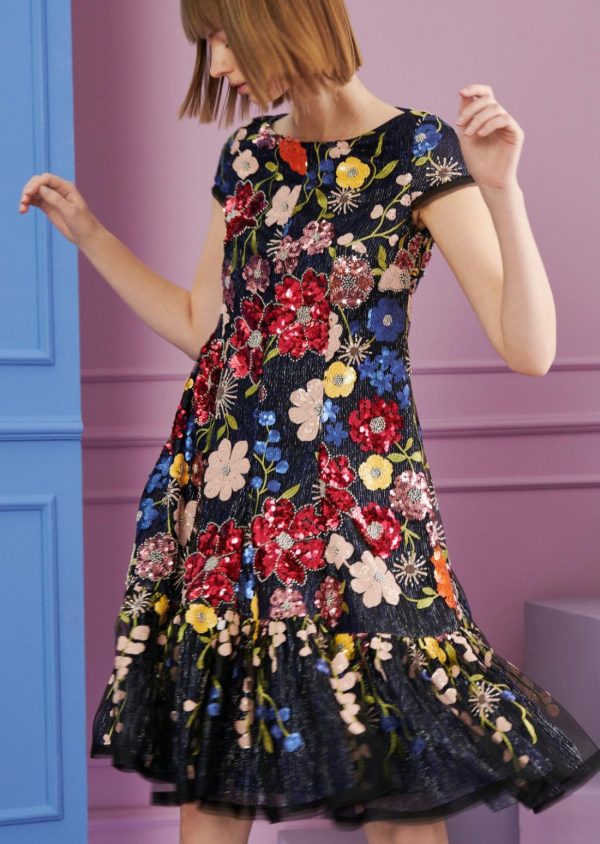 This knee-length cocktail dress with short sleeves and a subtle round neckline is a great piece for your next event: thanks to the loose fit, you never feel restricted. Despite this, it still gently follows the body’s silhouette. A wide flounce at the hem adds even more pizzazz when dancing. In this variation made of exciting sequin embroidery, you will be a sparkling eye-catcher anyway. But, at the latest, when you confidently conquer the dance floor, no guest will be able to look away.