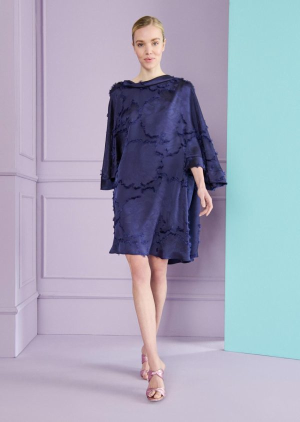 This super modern cocktail dress definitely makes a statement. Three, in fact. A statement of elegance, simplicity, and also extravagance. The oversized design makes its first impact with its fabulous fabric, a light fil coupé satin, quickly followed by its sophisticated cut. The sleeves are the result of a clever trick in which the fabric sections are simply twisted. A sweeping curve at the neckline creates a dynamic finish. This is a look that will turn heads. Especially when worn with dizzyingly high heels for an exciting contrast.