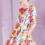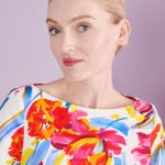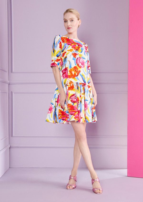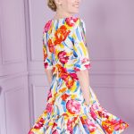 This summery day dress unites casualness and elegance. The cut is relaxed: loose at the waist, but with enough definition to produce a beautiful silhouette. Mid-length sleeves and an elegant bateau neckline round off the understated look nicely. We made this piece from a beautiful cotton fabric with a floral print. This dress is not only great during the day with flat leather sandals, it is, of course, also perfect for formal occasions, a big birthday celebration or your own wedding anniversary.