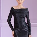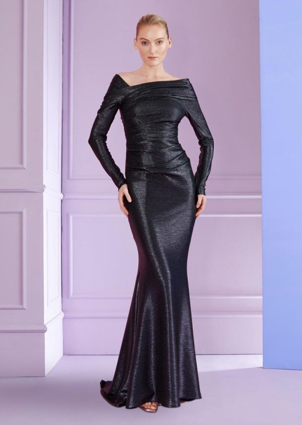 Behaving like a diva? That’s not your style! You prefer to express your inner diva through fashion with an exciting, glamorous look. This floor length evening gown helps you do just that. We made it out of an unbelievably comfortable mirrorball stretch fabric. This metallic fabric has a beautiful shine and is also very comfortable to wear. The cut is quite something, too. The asymmetric drape on the upper body accentuates the shoulders, while additional draping makes the waist appear slimmer. Long sleeves boost your self-confidence. Plus, the fishtail skirt accentuates the feminine silhouette. All this makes this evening gown a perfect piece for the red carpet, an opera premiere or a formal dinner.