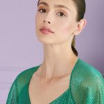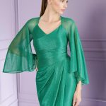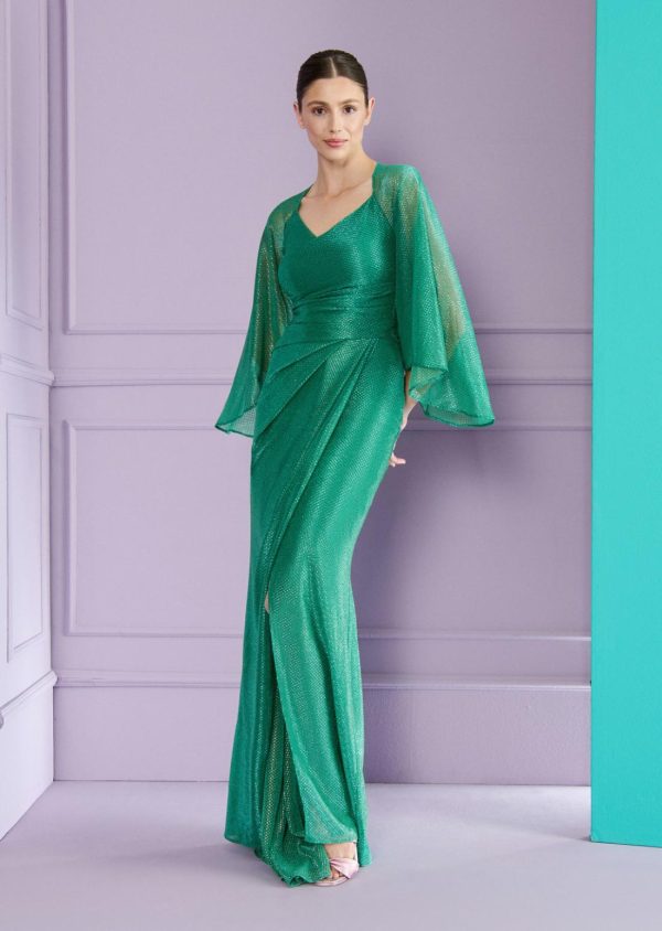 You’ll emanate hippie glamour in this evening dress, and althoughi t has longer sleeves, it’s still super sexy. A high slit offers a glance of your legs while dancing. An open and deep décolleté shows some skin, but remains elegant. While moving the wide sleeves swing wonderfully. On top of that, the ultra-light voile printed with metallic gold adds its own particular flair. Refined draping hides those problem zones away as well. A dress that belongs on the red carpet, or at the very least on the dance floor.