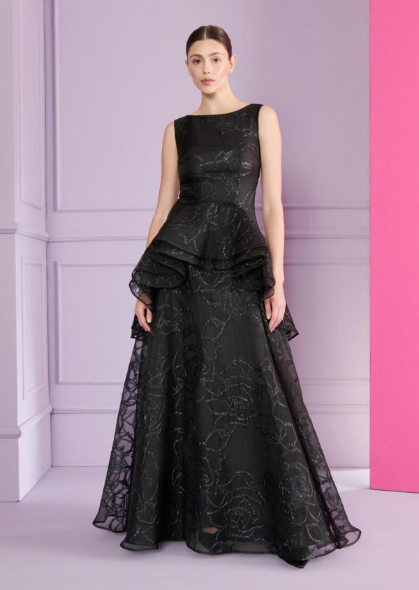 The wider, the better! And in this case, I mean that in the most literal sense: Our new evening gown, made of feather-light floral fil coupé, boasts a very special, wide silhouette. The top section is loose but still defines the figure. Underneath the flounce at hip height which makes the dress look like a two-piece, you can see the wide, swirling, floor-length skirt which is just waiting to be taken out onto the dance floor. The elegant bateau neckline rounds off the understated, glamorous look of this evening gown. Wear this dress to the next ball with moderate heels, or pull out all the stops with bold jewelry for an extravagant entrance at your next red carpet event.