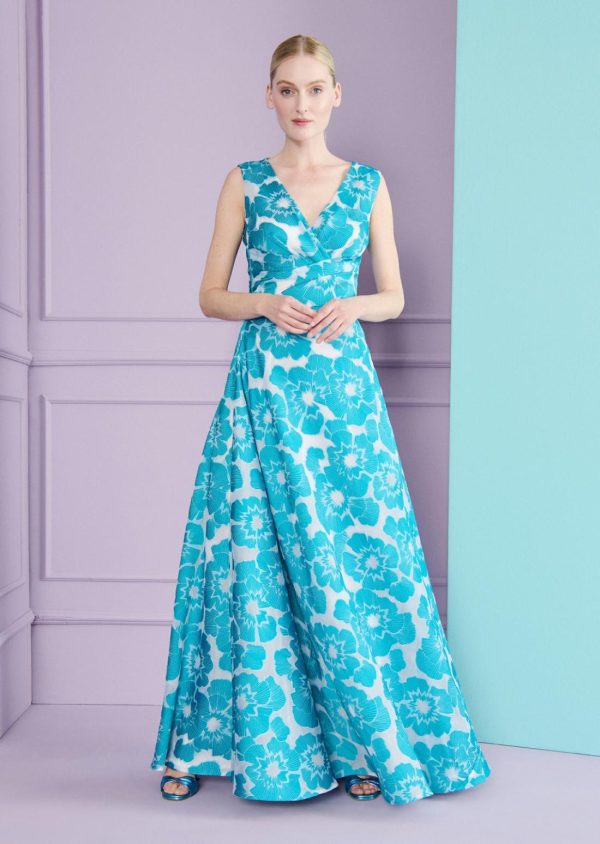 We are crazy about flowers, and these beautiful flowers are best of all: We made this evening gown from stunning fil coupé fabric that not only looks amazing, it is also extremely lightweight. At the same time, it strikes the perfect balance between nonchalance and glamor. Plus, this floor-length evening gown has lots of other great features: The criss-cross V-neckline draws attention to the décolleté. In this sleeveless design, it is particularly pleasant to wear on hot days. The artistic draping makes the waist appear instantly slimmer. And thanks to its material, this dress is not only stunning in the evening combined with a sophisticated choker, it is also a great choice for a beach wedding or big family celebrations – simply wear it with flat sandals and enjoy a unique look.