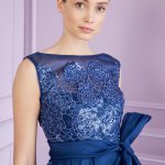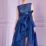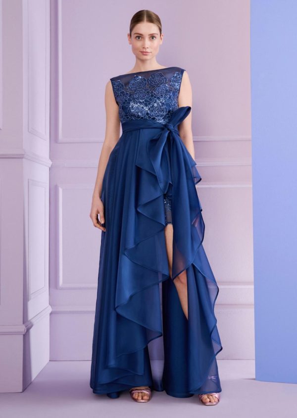 When sparkling floral embroidery meets delicate organza flowing in soft cascades with a generous width, nothing stands in the way of an unforgettable evening. The high neckline adds elegance, while the skin-colored lining has a modern, light look. The wide, swirling organza skirt delights with delicate flounces that create a high-low effect, as well as a high slit that reveals a short cocktail dress made of beautifully glittering lace. This cocktail dress forms the basis for the unique, glamorous look of this gown. An organza bow, tied from the center back to the front, adds another elegant accent and stylishly rounds off the design. An opulent look that makes a lasting impression – on the red carpet as well as at any formal event.