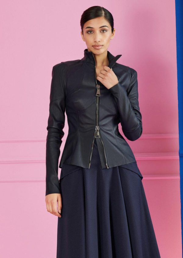 a biker jacket with a cocktail dress? you betcha! this is precisely why our designers created this leather jacket. the piece is understated thanks to its slim fit. on closer inspection, the sophisticated seams and the stand-up collar catch the eye, giving the jacket its avant-garde character. super soft stretch leather caresses your curves and accentuates your slender waist. the xl zipper adds an great unusual detail. whether you choose to team it with jeans and a t-shirt for a daytime shopping trip or pair it with our elegant fit & flare cocktail dress in the evening – with this leather jacket, you’ll always look stylish.