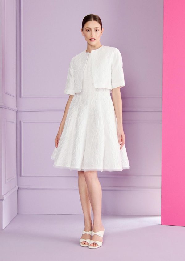Straight and simple yet so smart: this is not just any little half-sleeve jacket. The breathtakingly beautiful fabric is so striking at first glance, while great details reveal themselves on closer inspection. Raglan sleeves give this classic jacket a sporty note. The boxy fit looks modern but not too casual when teamed with the matching cocktail dress. At the registry office, the jacket is the perfect enhancement to the matching cocktail dress by Talbot Runhof but also looks stunning teamed with more casual looks.