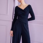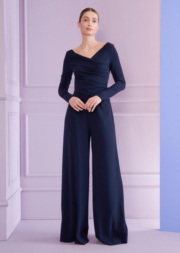 You’ll be wearing more than the proverbial pants at future business receptions and candlelight dinners. Because our jumpsuit gives you the elegance of a little black dress. Sculpted across the back and at the waist, the dark blue crêpe fabric extends into a wide trouser leg. Incidentally, this cut works equally well for any stature, from petite to tall. The naturally-formed bateau neckline and the beautiful narrow sleeves make this the perfect jumpsuit. Add a pair of pointy sling-back pumps to visually lengthen your leg. Or go for some cheeky boots and let your inner fashionista come out to play.