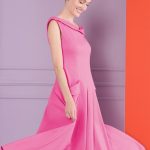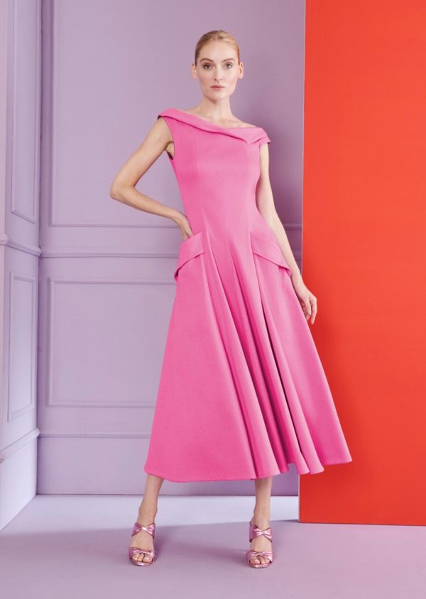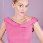 Back to the future – because time travel is now possible! We have managed to bring the glamor of the fifties to the current day. Our new midi dress combines the elegant fifties style with a clean, modern silhouette. The twisted stand-up collar, the narrow waist, and the swirling, flared skirt in a midi length quote the past, while the modern, understated panel cut, and the subtly shimmering piqué material translate the look for today. It’s the perfect way to celebrate all those lovely occasions during the day, the coffee with friends, the brithday party in the afternoon and even festive events like weddings or cocktail events – in this dress you dance late into the night looking radiantly beautiful!
