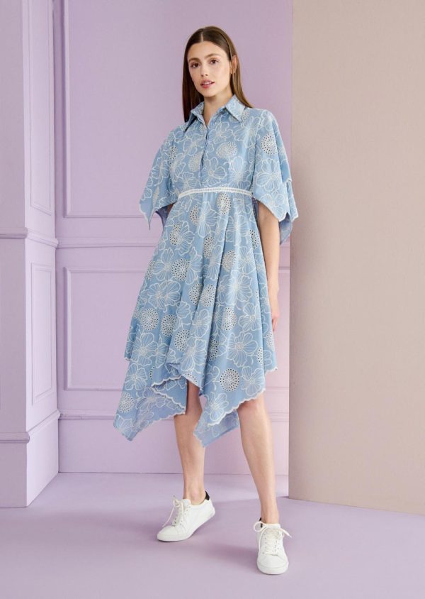 So simple and yet so thrilling – our new shirt dress plays with minimalist shapes in the cut and combines them to create a particularly exciting day dress. The result is a casually elegant look with wide sleeves and a handkerchief-style skirt. We made this midi-length dress in a summery, lightweight broderie anglaise. It’s perfect for hot weather when you still want to surprise someone with your sensational look. During the day, style it with flat sandals or sneakers. In the evening, high-heeled sandals make a great contrast.