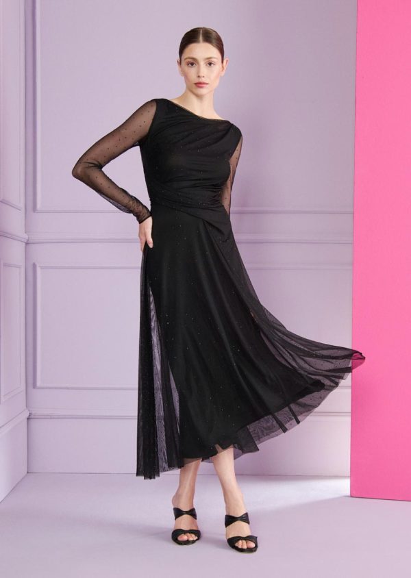 “every woman should add this dress to their online order,” says adrian runhof about this cute number, one of his top favorite dresses. this season it comes in a fashionable midi length. this cute piece is youthful and feminine whatever your age or size. and on top of that, the lightweight and flowing stretch tulle and long sleeves make it suitable for cooler weather in the evenings. whether you wear it to dinner, cocktails, or to the theater, team with heels and cheerful jewelry. even paired with biker boots and a leather jacket, this midi dress will never fail.