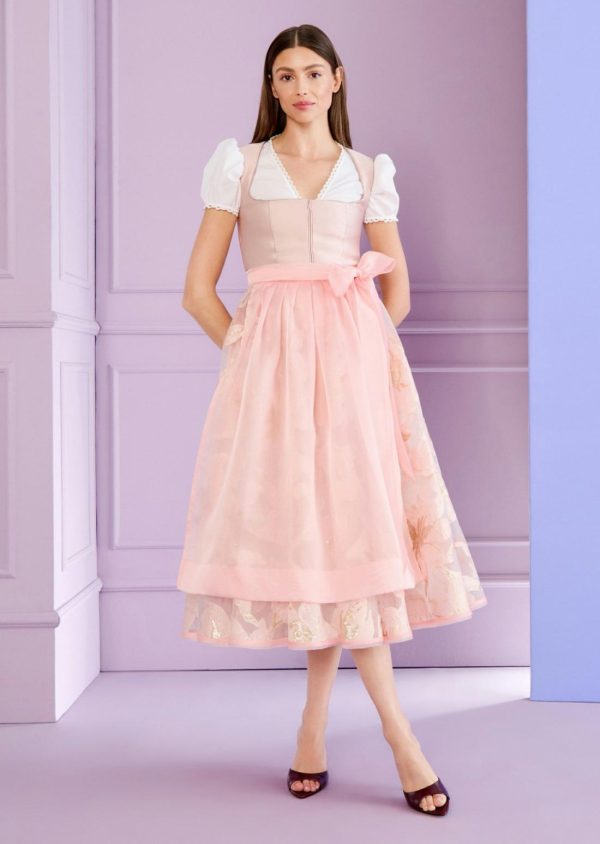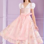 The Talbot Runhof dirndl gives your wedding guest look a certain glamorous but still traditional charm. The cut remains respectfully classic, but is re-imagined in a modern way throught the brand’s signature design aesthetic. The dirndl itself is made from a sophisticated Duchesse silk satin in marble pink and a wonderfully lightweight floral jacquard. With its soft sheen, it lends your look an opulent radiance. The delicate organza apron stylishly rounds off the ensemble and strikes the perfect balance between tradition and modernity. The practical zipper at the front makes it easy to put on and take off, while the classic cut elegantly accentuates the décolleté. The feminine midi length also creates a timeless silhouette that will look great on your big day, but is also easy to wear for the big party after the ceremony. So you can dance relaxed into the night and celebrate the happy couples love for each other.