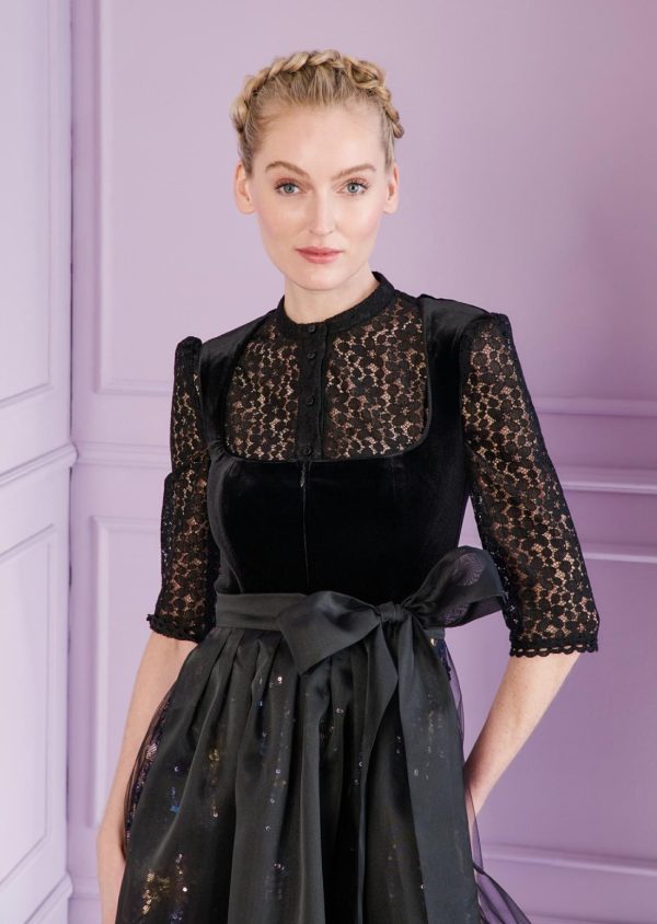 Now things are heating up – with our new dirndl blouse! This is ideally combined with one of our Talbot Runhof dirndls to create a stylish and harmonious look. This season, we present a decidedly elegant interpretation of the traditional design: high-necked, with a short stand-up collar and mid-length sleeves. The understated design looks sophisticated and leaves room for the imagination – resulting in a subtly seductive effect. The blouse is made of delicate lace, which contrasts beautifully with glamorous dirndls made of sequin-embroidered tweed or other fine fabrics. A perfect addition to your elegant Oktoberfest outfit!